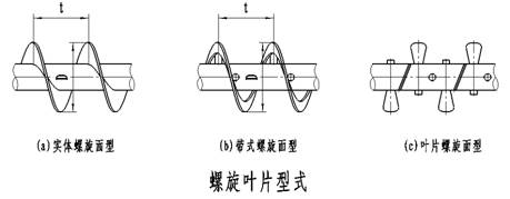 ⑴螺旋輸送機(jī)的螺旋葉片有實(shí)體螺旋面型、帶式螺旋面型及葉片螺旋面型三種,分別如下圖(a)、(b)、(c)所示。實(shí)體螺旋面稱為S制法,其螺旋節(jié)距為葉片直徑的0.8倍,適用于輸送粉狀和粒狀物料。帶式螺旋面又稱D制法,其螺旋節(jié)距與螺旋葉片直徑相同,適用于輸送粉狀及小塊物料。葉片式螺旋面應(yīng)用較少,主要用于輸送粘度較大和可壓縮性物料,在輸送過程中,同時完成攪拌、混合等工序,其螺旋節(jié)距約為螺旋葉片直徑的1.2倍。