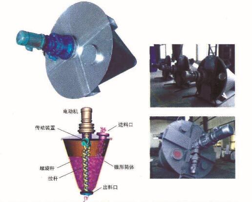 YSH型雙螺旋錐形混合機(jī),它由噴液裝置、傳動部分、筒蓋、螺旋、簡體、出料閥箱等組成。